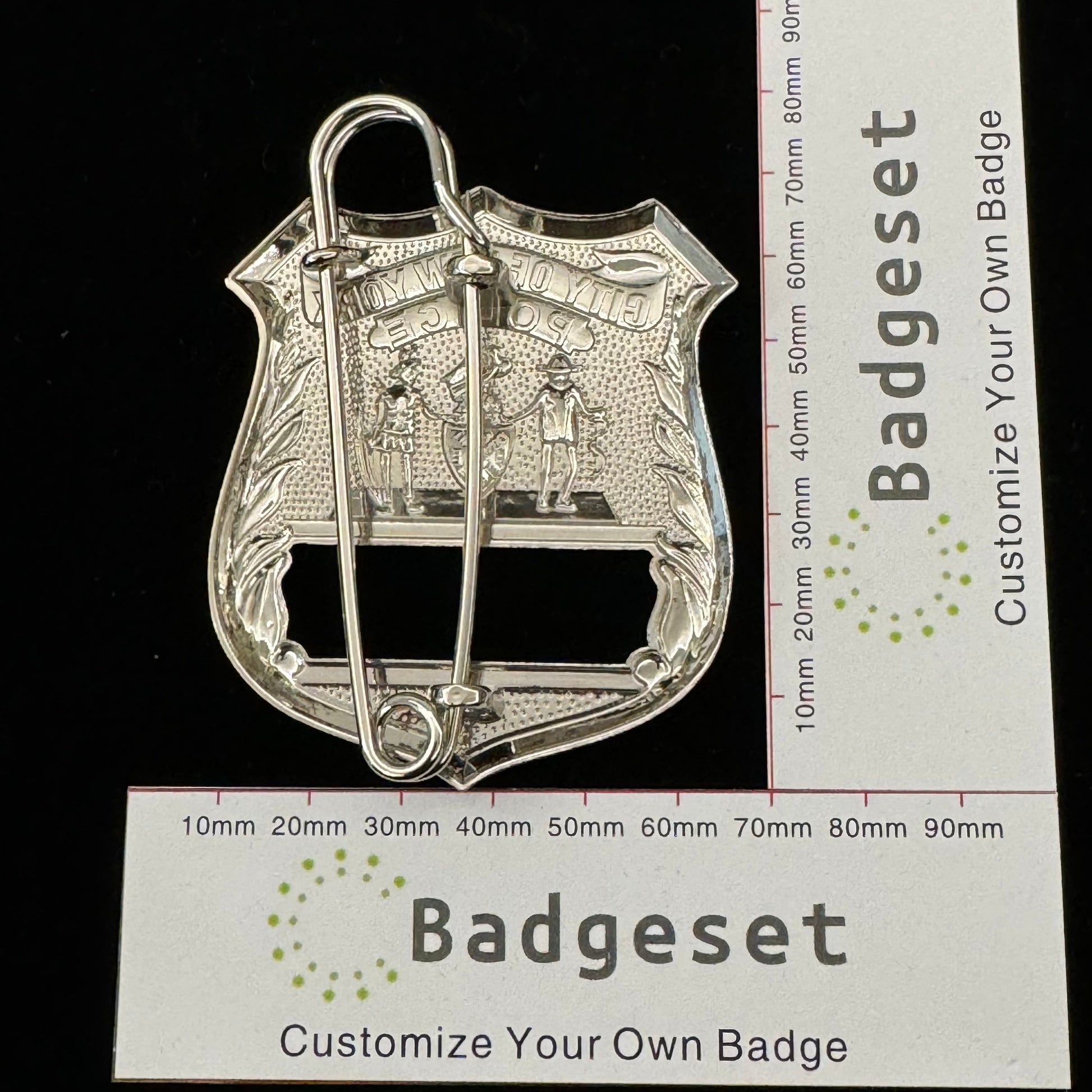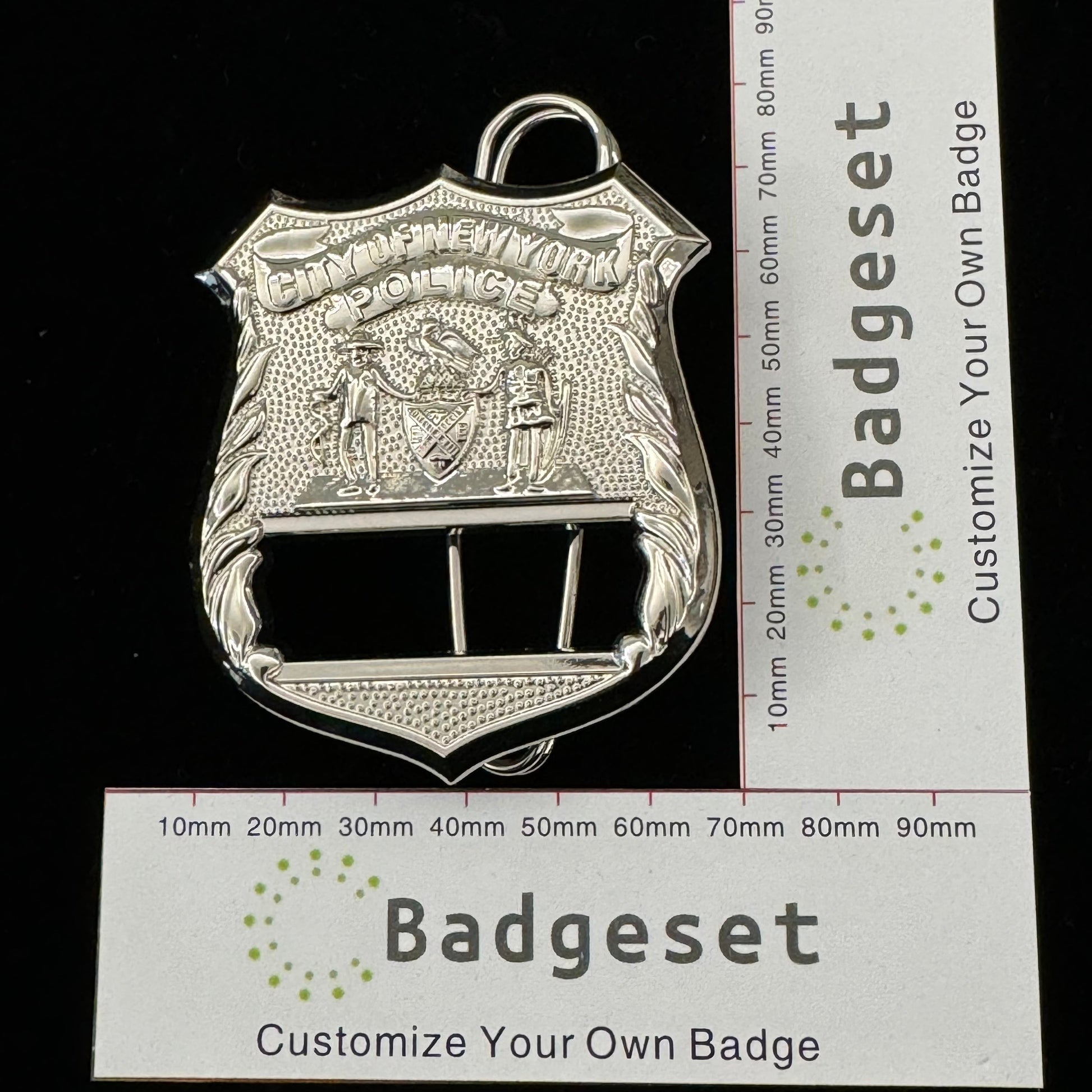 - **Dimensioni:** Il distintivo è progettato per adattarsi alle dimensioni standard di un distintivo della polizia di New York e il cappuccio è dimensionato in modo appropriato per adattarsi al distintivo.